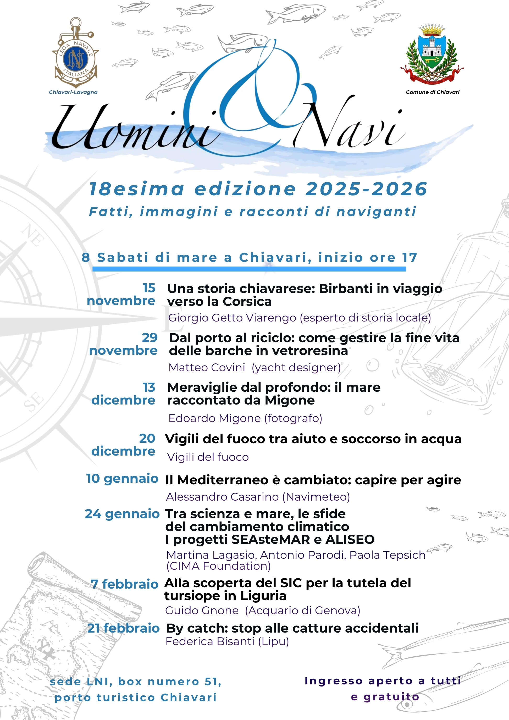 Otto incontri fra novembre 2025 e febbraio 2026 previsti il sabato alle 17.00 nella sede della Lega Navale al Porto turistico di Chiavari (box numero 51, Porto Turistico di Chiavari):