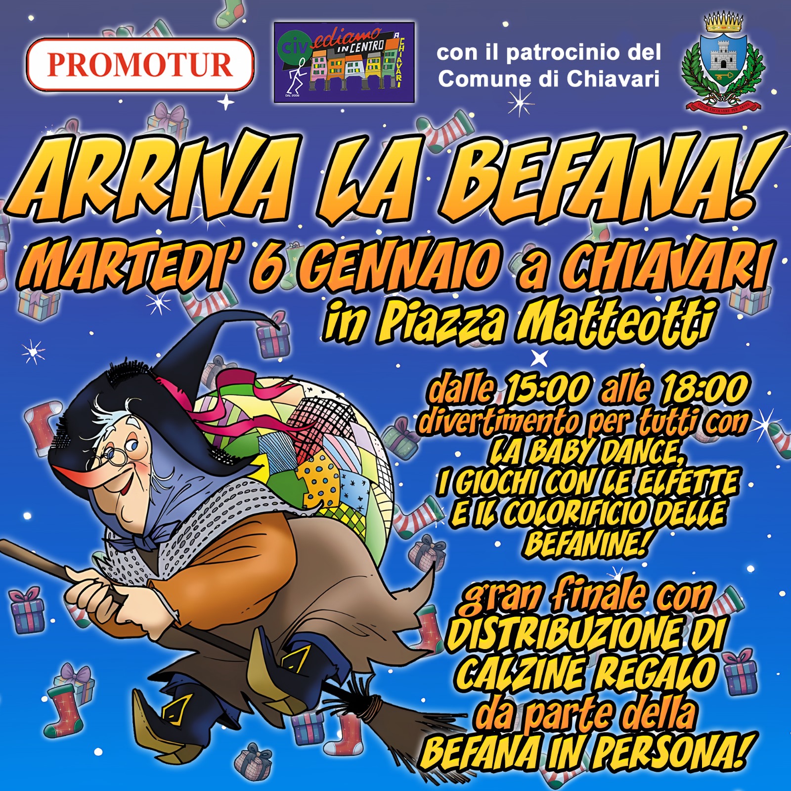 Divertimento per tutti, grandi e piccini! Arriva la Befana martedì 6 gennaio a Chiavari in Piazza Matteotti, dalle 15:00 alle 18:00 è prevista la BABY DANCE, i giochi con le ELFETTE, il colorificio delle BEFANINE. Gran finale con la distribuzione delle CALZINE REGALO da parte della Befana in persona! Evento ad accesso libero e gratuito.