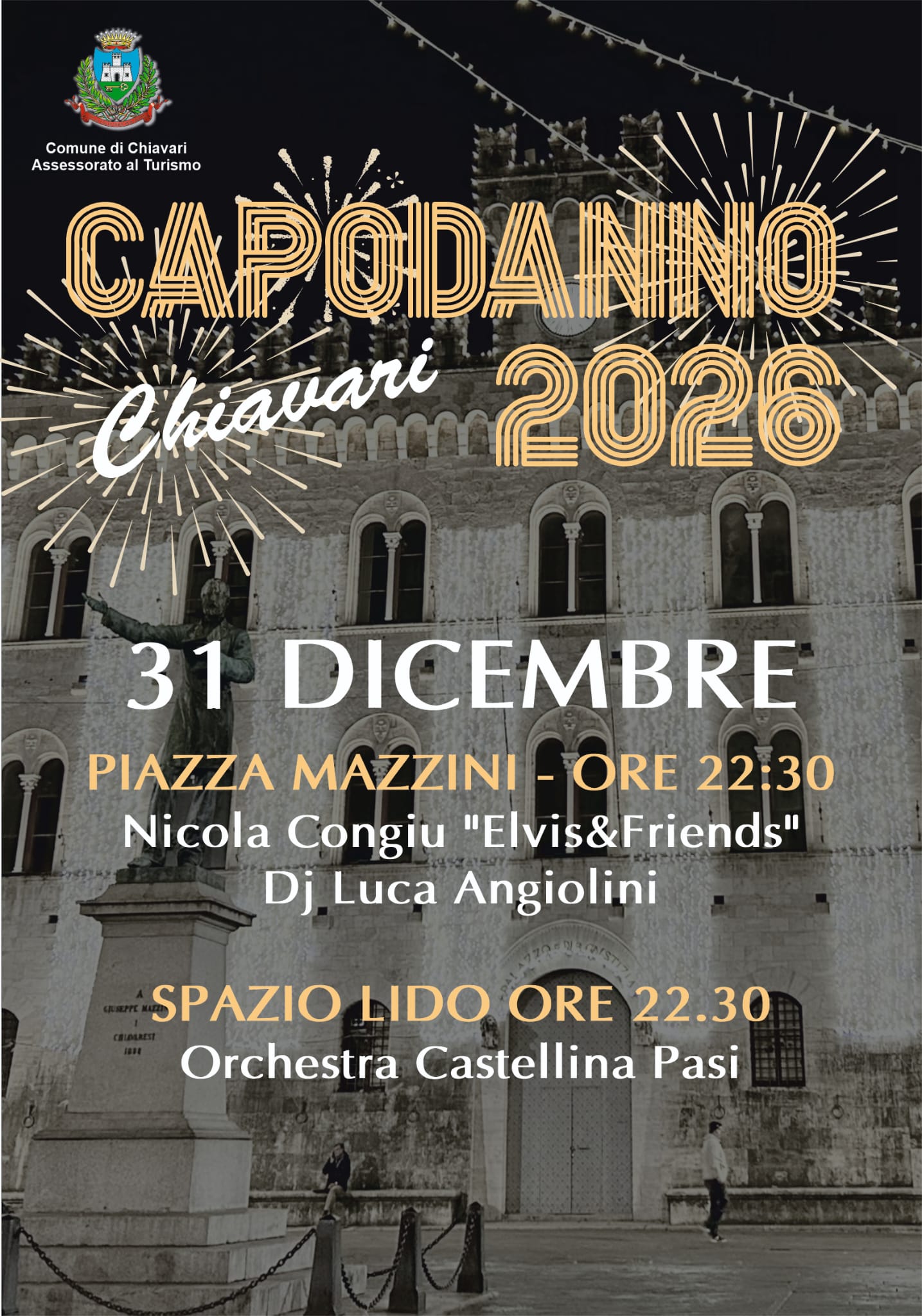 Il Capodanno chiavarese offrirà un doppio appuntamento. In piazza Mazzini, il concerto dalle 22.30 “Elvis & Friends”, tributo ad Elvis Presley con Nicola “Niko” Congiu, seguito da DJ set; allo Spazio Lido, dalle 22.30, il ballo liscio con l’orchestra Castellina Pasi. Dalle 00.30, in Piazza Rupinaro, torna la tradizionale Zabaionata grazie al Circolo ANSPI Gruppo Pino Solari Ommi de Ruinà