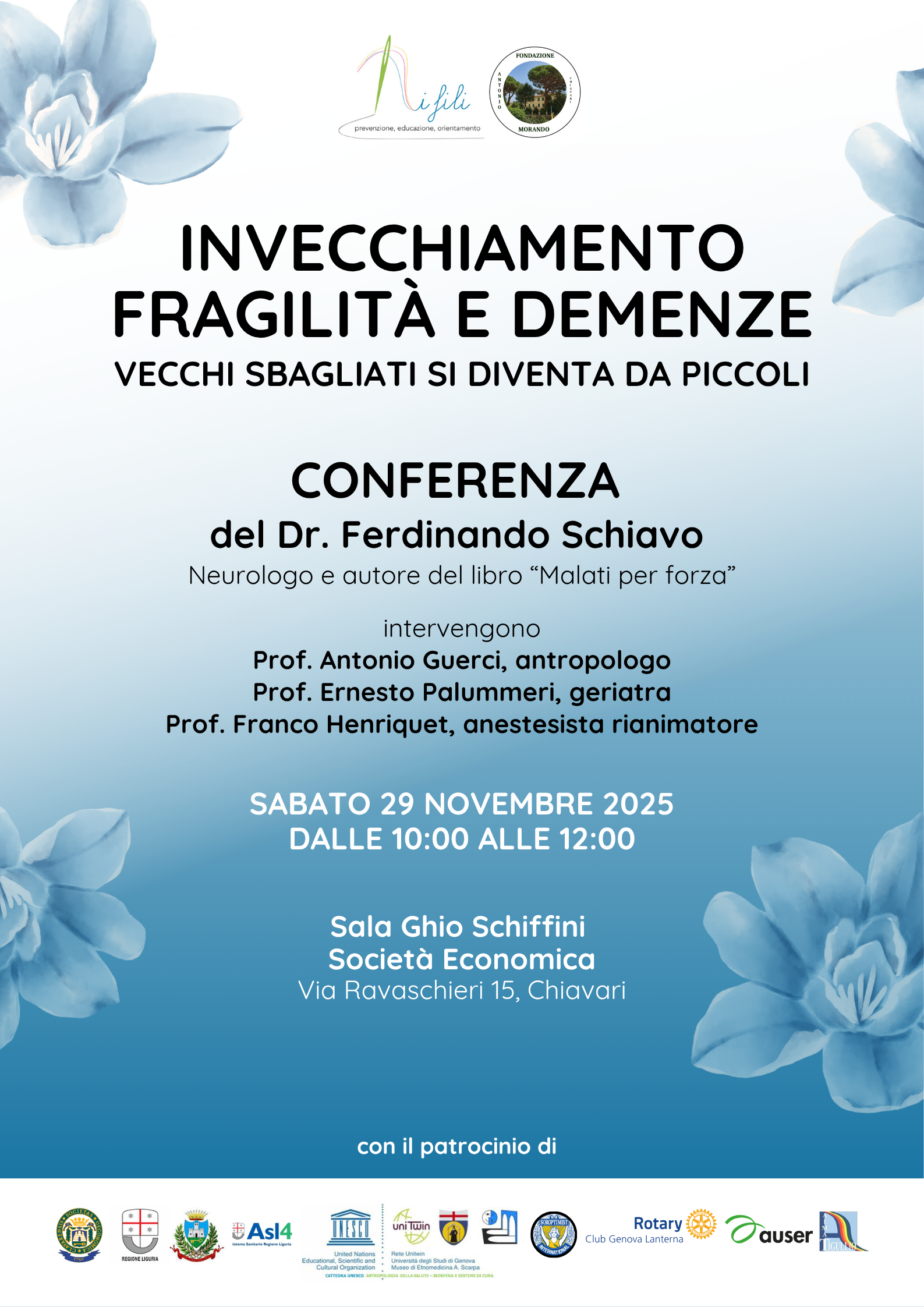 Sabato 29 novembre, dalle ore 10.00 alle ore 12:00, nella Sala Ghio Schiffini della Società Economica in Via Ravaschieri a Chiavari si terrà la conferenza “Invecchiamento, fragilità e demenze. Vecchi sbagliati si diventa da piccoli”, evento patrocinato dal Comune di Chiavari e organizzato dall’associazione di promozione sociale I Fili, in collaborazione con la Fondazione Antonio Morando.