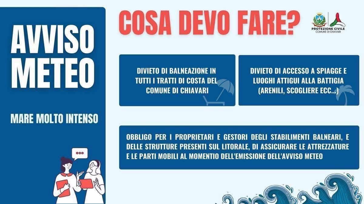 Si ricorda, come indicato nell'ordinanza n.3 del 10/01/2023, che per tutta la durata dell'avviso è vietata la balneazione e l'accesso a spiagge, pontili e frangiflutti sui tratti di costa. I proprietari/gestori degli stabilimenti devono assicurare le attrezzature e le parti mobili delle loro strutture. Si raccomanda alla popolazione di mettere in atto le misure di autoprotezione