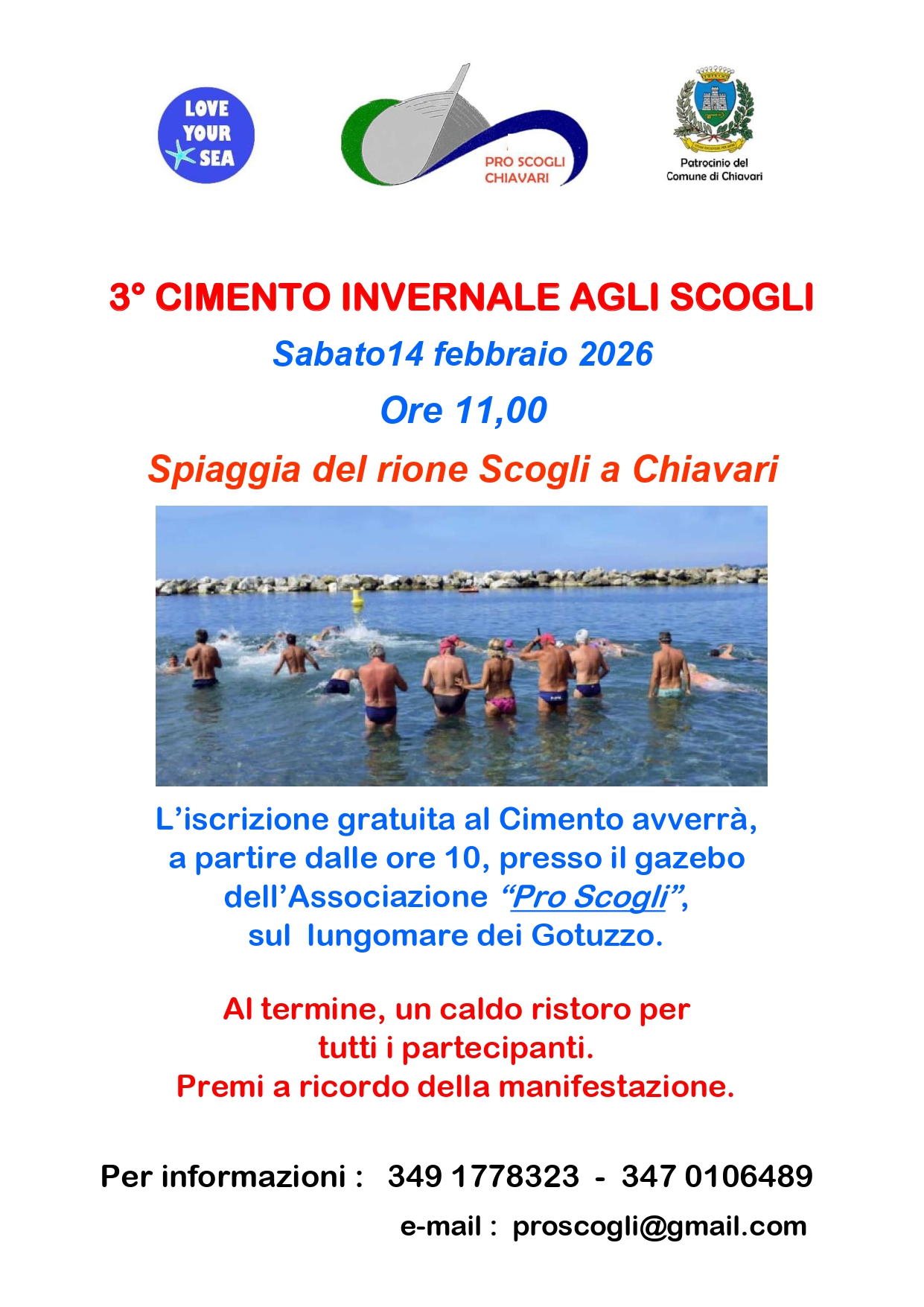 Sabato 14 Febbraio 2026 ore 11.00 si svolegrà presso la Spiaggia del Rione Scogli il 3° Cimento Invernale, patrocinato dal Comune di Chiavari.